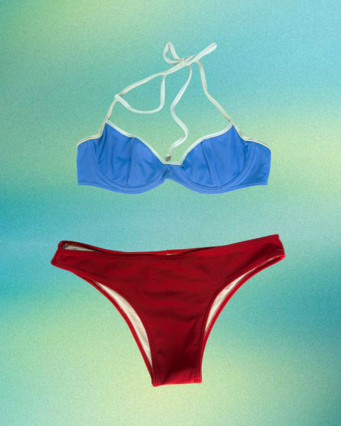 Quem disse que o biquíni precisa ser de uma cor só para ser perfeito? Esse conjunto é para quem ama fugir do óbvio. O top azul possui um detalhe em viés claro que valoriza o busto, enquanto a calcinha vermelha traz aquele contraste vibrante que realça o bronzeado.