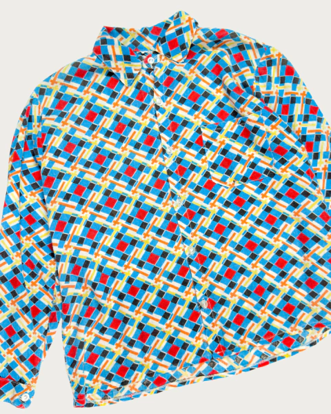 Miguel é uma camisa vintage lindíssima e cheia de personalidade! Sua estampa é uma complexa sobreposição de padrões geométricos em losangos que se cruzam em cores elétricas e fortes. Com modelagem solta e confortável e mangas longas, ela é versátil o suficiente para o trabalho, encontros casuais ou eventos descontraídos. Possui um bolso discreto no peito e o colarinho clássico.