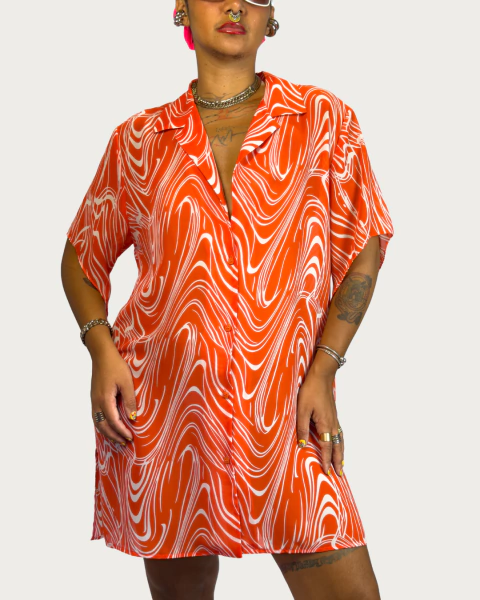 Valência é uma camisa vintage belíssima que entrega a estética psicodélica e ousada dos Anos 70, com um toque de arte moderna e vibrante. Sua cor de fundo é um Vermelho Vivo/Cereja que salta à vista, enquanto a estampa abstrata em Branco é formada por linhas orgânicas e onduladas, criando um efeito de movimento hipnotizante e dinâmico. Com uma modelagem oversized (extra larga e solta) e mangas curtas despojadas, ela é ideal para ser usada com leveza e dar um toque funky ao seu dia a dia. O colarinho aberto e o abotoamento discreto completam o visual relaxado.
